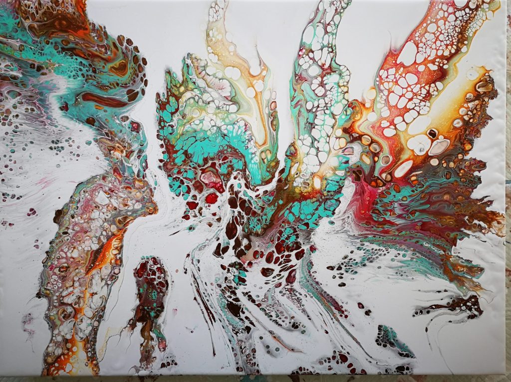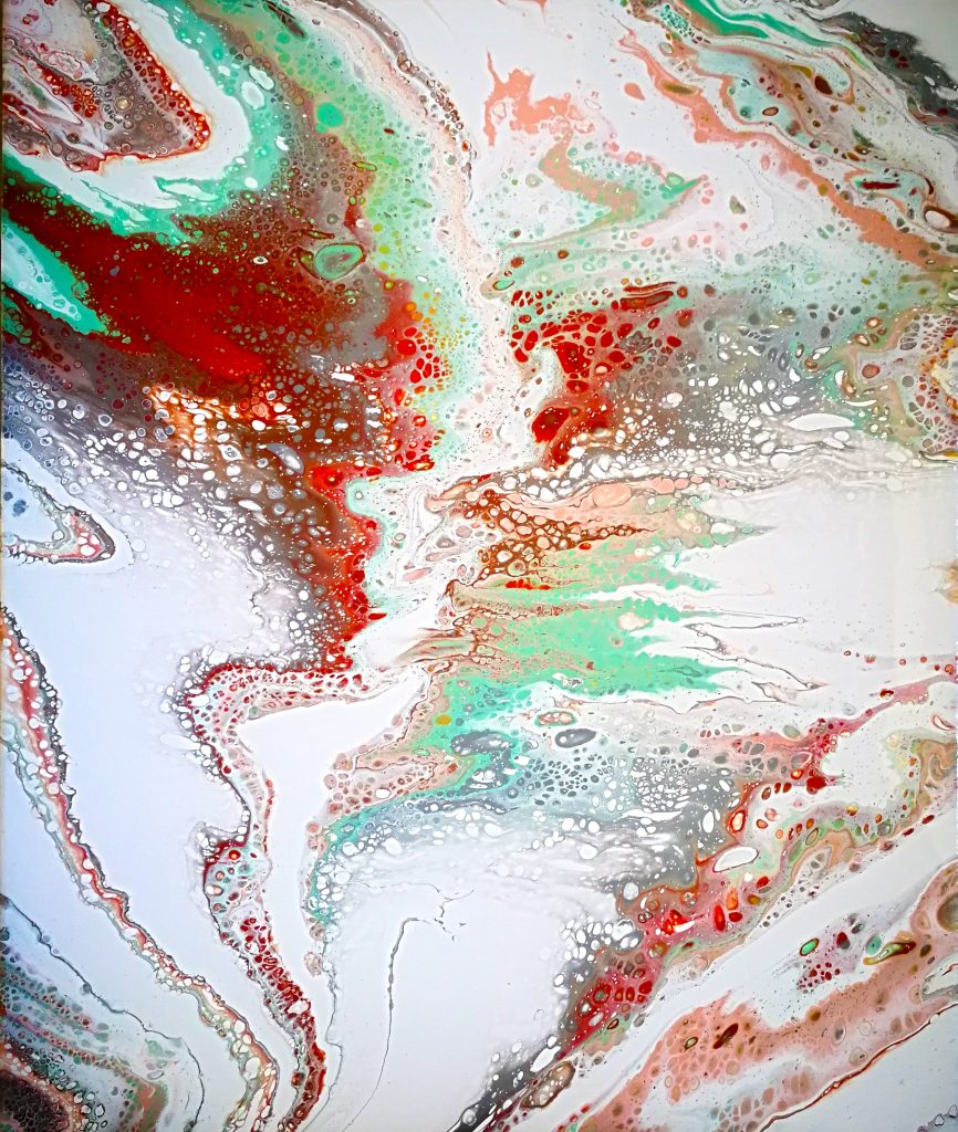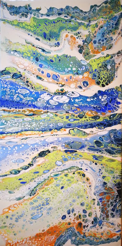 Akrylmåleri med Fluid Paint, en innovativ teknik där färgen får flöda över duken och skapa dynamiska mönster. Varje målning är ett exklusivt konstverk som inte går att repetera eller återskapa.