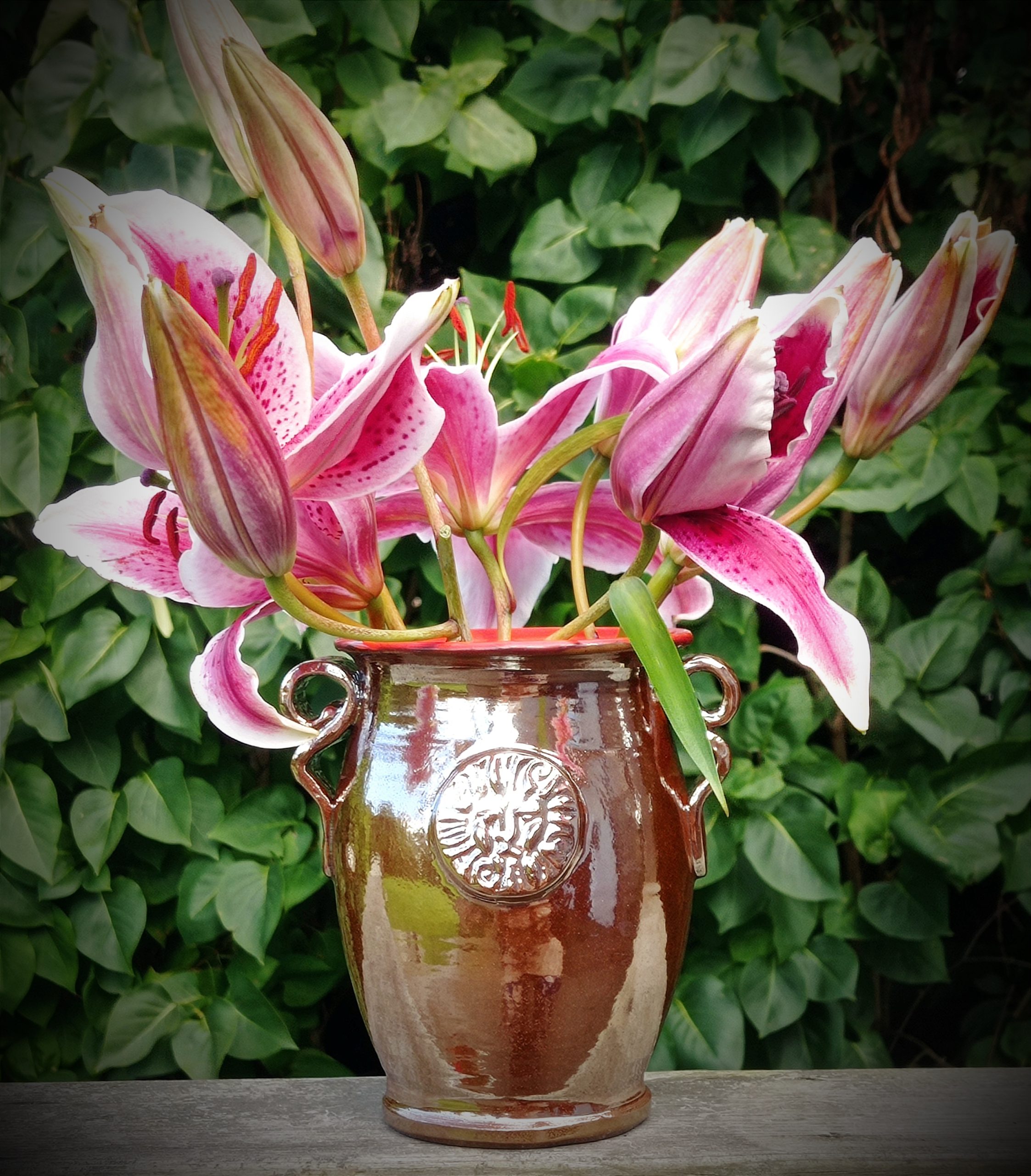 Denna unika vas har skulpterade detaljer och är glaserad med guldbrons utanpå och rött inuti.